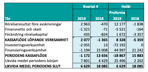 - Rörelseresultatet före avskrivningar (EBITDA) uppgick till 12,2 MSEK. Proforma för helåret 2018 var EBITDA 6,2 MSEK. Justerat för engångskostnad på 0,8 MSEK uppgick EBITDA till 13 MSEK 2019.
