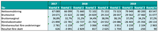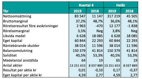 Koncernens rörelseresultat före avskrivningar (EBITDA) uppgick under fjärde kvartalet till 3,0 MSEK. Rörelseresultatet före avskrivningar sista kvartalet 2018 var proforma 4,7 MSEK. Koncernens rörelsekostnader har ökat under perioden jämfört med samma period 2018 till följd av ökade driftskostnader i Laholm efter produktionsstarten av smartsnackslinan samt en högre hyresnivå i nya lokaler.