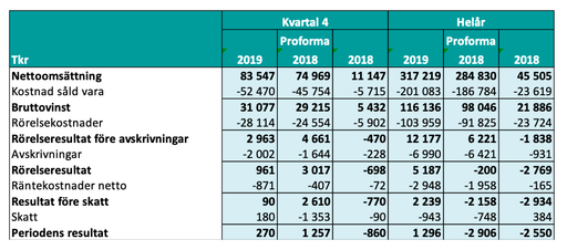 - Nettoomsättningen för helåret uppgick till 317,4 MSEK vilket motsvarar en ökning med 11 % jämfört med nettoomsättningen för samma period proforma 2018 på 284,8 MSEK.